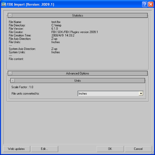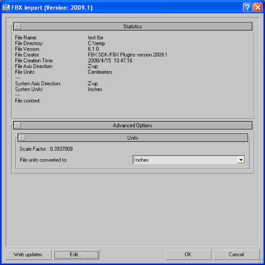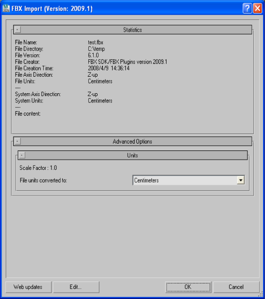 If you import a file that is in the same Unit setting as the System Units of your 3ds Max scene, there is a match of units and the displayed Scale Factor will be “1.0”. No scale conversion is applied.