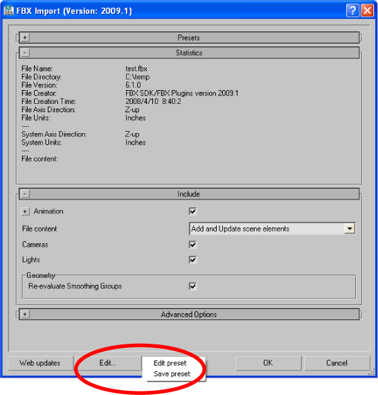 Access the Edit/Save preset options through the Edit button in the FBX plug-in UI.