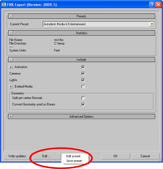 Access the Edit/Save preset options with the Edit button in the FBX Exporter UI.