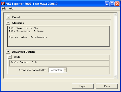 If you export a file that is in the same Unit setting as the System Units of your Maya scene, there is a match of units and the displayed Scale Factor will be “1.0”. No scale conversion is applied.