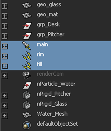 To prepare your scene for rendering, you assign mental ray mia_material_x shaders to the pitcher, glass, and water meshes. Lights have been created and placed in the scene so that realistic shadows and reflections appear in the rendered frame. The scene also includes a camera named renderCam that is positioned for the rendered view. For more information about rendering, see the Rendering and Render Setup guide.