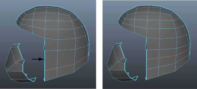 The edge of the mesh on the lower front region of the helmet is comprised of five edges. The corresponding region on the side region of the helmet only has three. You can increase the number of edges on the lower side region by inserting two edge loops across the mesh. Inserting two edge loops in this region of the mesh also divides the large faces so they better match the size of the other faces on the rest of the mesh.