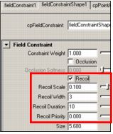 FieldConstraintShapenode. These properties allow you to control how your field constraints affect their cloth’s subtle motions. Previously, you could only set recoil properties for cloth collisions. See Recoil.- Recoil is now based on priority. With the new Recoil Priority attribute, you can now set the priority for your cloth collision and field constraint recoil. This attribute lets you set the order in which your collision and field constraint recoil properties take effect. By default, collision recoil takes priority over field constraint recoil. See Recoil Priority.