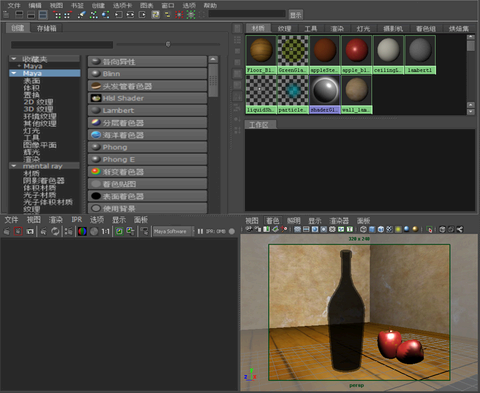 瓶子场景使用 mental ray for Maya 渲染器渲染,图像将显示在“渲染视图”窗口中。