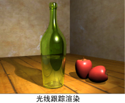 - 半透明的瓶子,它旁边的苹果朝场景后部投射阴影。注意在渲染光线跟踪时阴影如何显示。