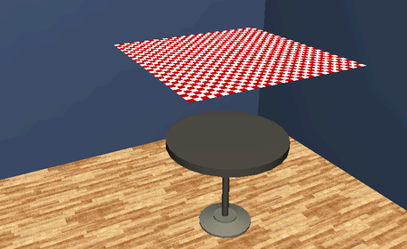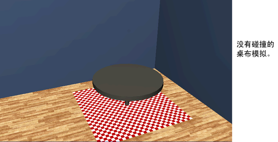 桌布恰好经过桌子、桌腿和地板。这是因为 nCloth 无法识别场景中的任何其他对象。为使 nCloth 桌布能够与桌子、桌腿和地板交互,需要使桌子、桌腿和地板像桌布一样,成为 Maya Nucleus 解算器系统的成员。