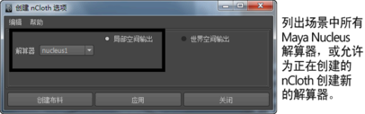 定义空间输出可确定是桌布的输入和输出 nCloth 网格(“局部空间输出”(Local Space Output))都附加到选定 Maya Nucleus 解算器,还是仅输出 nCloth 网格(“世界空间”(World Space))附加到选定 Maya Nucleus 解算器。