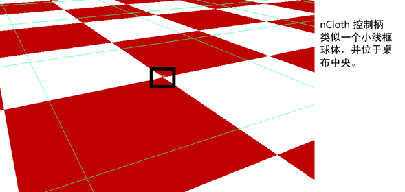 会自动细分静态四边形多边形桌布并将其转化为动态 nCloth 对象,而且在场景视图中的桌布上将显示一个 nCloth 控制柄。nCloth 控制柄类似于一个小线框球体,它位于桌布的中心。可以使用桌布的 nCloth 控制柄在 Hypergraph 中或在“属性编辑器”(Attribute Editor)中桌布的选项卡中快速选择桌布的 nClothShape 节点。
