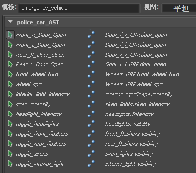目前未绑定门属性,因为门的内部节点名称不同(在消防车上称为 Cab_door,而在警车上仅称为 Door),所以模板无效。若要完成该模板,必须手动进行绑定。