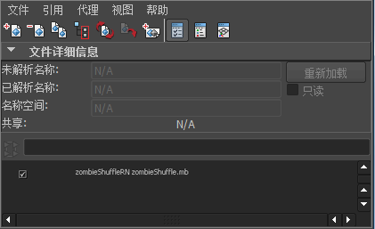 将在“引用编辑器”(Reference Editor)中显示第二个名为 zombieShuffleRN1 zombieShuffle.mb 的条目。