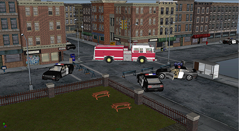 请注意,资源范围很广,包括非常简单的对象(垃圾袋,垃圾桶),对象集合(公园)以及包含移动部分的复杂对象(警车),但所有这些对象在场景中都视为单个黑箱资源节点(每个具有一个界面)。通过将所有类似对象(例如,所有垃圾袋和垃圾桶)放置在单个资源中,可以进一步进行该操作。