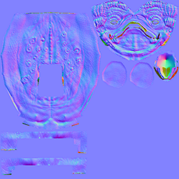 法线贴图不同于纹理贴图,因为法线贴图会基于高分辨率(源)网格的法线生成多通道图像(如下所示)。该信息用于以令人信服的方式照亮低分辨率(目标)网格上映射的细节,即使曲面本身相对平坦。
