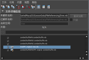 将在引用文件旁边显示一个新图标,且名称将更改为“引用编辑器”(Reference Editor)中的 treePM original tree.mb。但是,场景中的任何内容都未更改。
