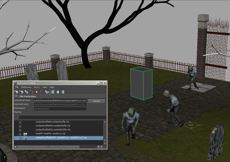 如果在“大纲视图”(Outliner)中选择任何代理并在场景中四处移动它们,则所做的更改会同时影响代理和原始被引用文件。这样可以装扮场景,并使用简单的代理而不是其更复杂的原始对象进行测试。