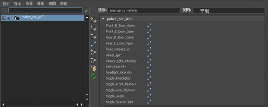 police_car_AST 区域中的大多数属性图标会变为绿色。这表示已将这些属性绑定到在模板中发现的相同的已发布名称。