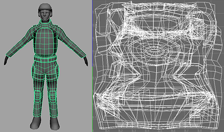 如果选择多边形士兵,您会注意到身体、手臂和腿部的 UV 将散射到一个与实际模型并不相似的图案中。这对于绘制纹理贴图没有太大帮助。