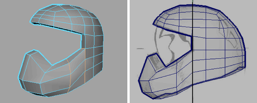 位于头盔较低的前区域上的网格边由五条边组成。头盔侧区域上的相应区域仅由三条边组成。可以通过插入两条横跨网格的循环边,增加较低侧区域上的边数量。在该网格区域中插入两个循环边也会拆分较大的面,以使这些面的大小与网格其他部分上面的大小相匹配。