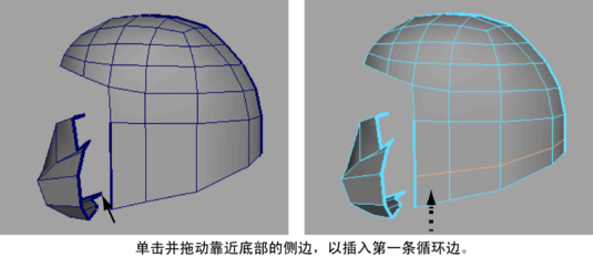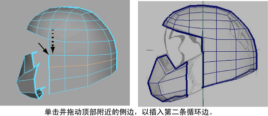 - 当仍处于活动状态时,单击并拖动位于同一条边顶部附近的头盔侧区域,然后沿边在约三分之二的距离处插入第二个循环边。