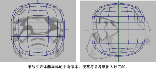 如果已平滑的立方体的上方圆顶部分不能大致与头盔草图匹配(如下图所示),请使用“缩放工具”(Scale Tool)缩放立方体以使立方体匹配。