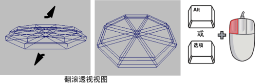 通过翻滚视图,可围绕场景视图中心在拖动方向(可以向左、右、上、下任一方向)上旋转摄影机。在正交视图中无法使用。