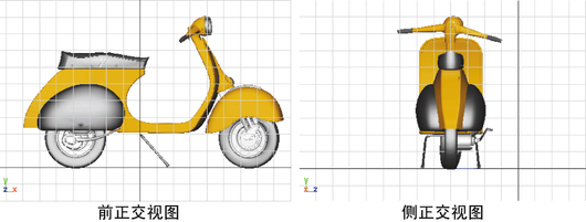 到目前为止的课程中,当您从顶视图、前视图或侧视图中查看对象时,您就是在通过正交视图查看场景。由于使用一次只有两个轴的平行投影来显示对象,所以正交视图看起来是二维的。(踏板车图像由《Maya 的艺术》一书提供)