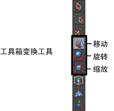 “工具箱”(Toolbox)的上半部分包括了用于在 Maya 内变换对象(选择、移动、旋转、缩放)的多种工具。将鼠标光标移动到任何变换工具图标上,即可在鼠标光标旁看到该工具的名称。