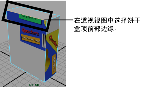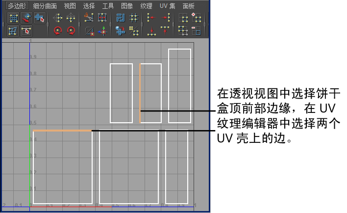 在场景视图中选定顶部前边时,其中一个大型 UV 壳的顶边以及“UV 纹理编辑器”(UV Texture Editor)顶行中的中型 UV 壳的左侧也会被选定。对于饼干盒纹理贴图,需要将它们缝合到一起,以便它们与该贴图正确相关。