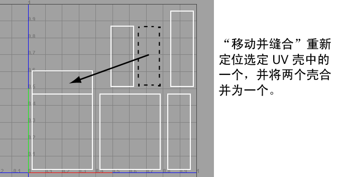 会重新定位小矩形 UV 壳,以使其与大型 UV 壳的顶部相匹配,并使这两个壳合并为一个。以后选择并移动这个已缝合的壳时,它将作为一个片段移动。如果选择两个 UV 壳进行缝合,则会将最小的 UV 壳移动到较大的 UV 壳。