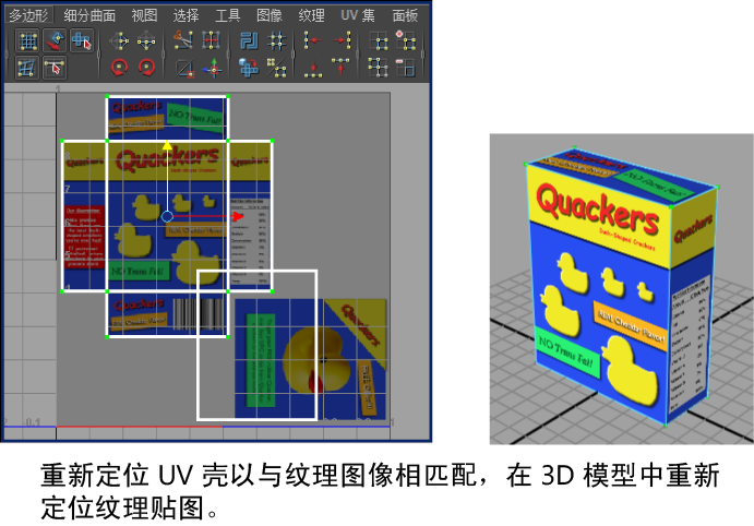 在接下来的步骤中,将在“UV 纹理编辑器”(UV Texture Editor)中重新定位这两个 UV 壳,使这两个 UV 壳与纹理图像重合。