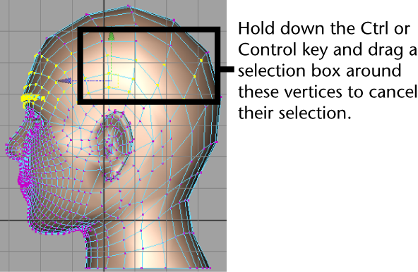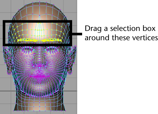 For these vertices, you need to select the vertices by dragging a selection box rather than by using the Paint Selection Tool. The eyebrows have vertices that lie behind its outer surface. The Paint Selection Tool selects only vertices at the outer surface. Dragging a selection box selects all vertices in the boxed region, including vertices that lie behind the outer surface.