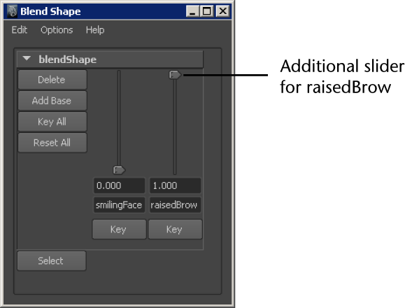 When you created the blend shape for the smile, Maya created a node named blendShape that contains the slider attributes that adjust the blend into the smilingFace target. The Add operation creates a blend shape for the raisedBrow and adds it to the blendShape node. This adds a slider to the node’s Blend Shape editor for adjusting the raised brow deformations.