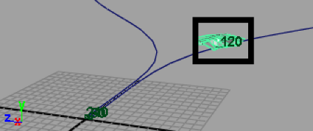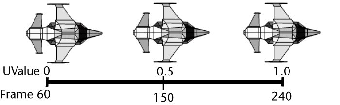 By default, the parameterization of a path curve is set between zero and one. At frame 60, the aircraft is at the beginning of the curve where the parameterization value is zero. When the aircraft is at the end of the curve (frame 240) the parameterization value for the curve is one. When the aircraft is halfway through the path animation (frame 150), it is located along the curve at a U Value of 0.5.