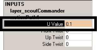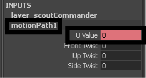 The U Value attribute controls where the aircraft gets positioned along the curve. The U Value refers to the curves parameterization. Parameterization is a method used by Maya to divide a curve into increments of known amounts so that a location along the curve can be determined.