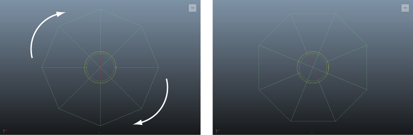 现在需要略微旋转座基圆柱体,使座基的前部与栅格线平行。因为八边形的每面表示圆的 45 度,所以需要将对象旋转约该数值一半的度数即 22.5 度。
