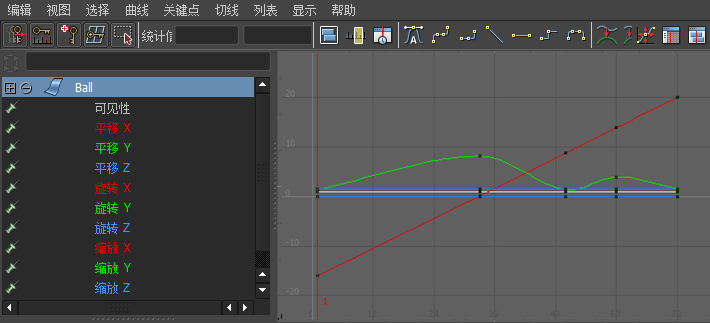 “曲线图编辑器”(Graph Editor)将显示若干条动画曲线,球的每个已设置关键帧的属性对应一条。在左侧列中会列出球的可设置动画的属性。具体地说,曲线图编辑器将显示球的选定变换节点的属性。