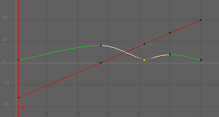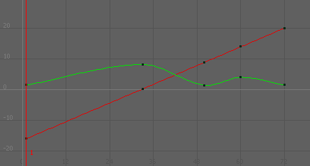 绿色曲线表示“平移 Y”(Translate Y),而红色曲线表示“平移 X”(Translate X)。每条曲线的颜色都与其属性名称相匹配。对于 X、Y 和 Z(红、绿、蓝),这种颜色方案在整个 Maya 中都是一致的。