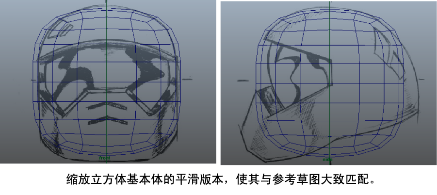 将通过使用图像平面作为参考,基于立方体基本体创建头盔网格的顶部。基本体对象是开始 3D 网格的一种方法,因为可以对这些对象进行修改以创建其他形式。