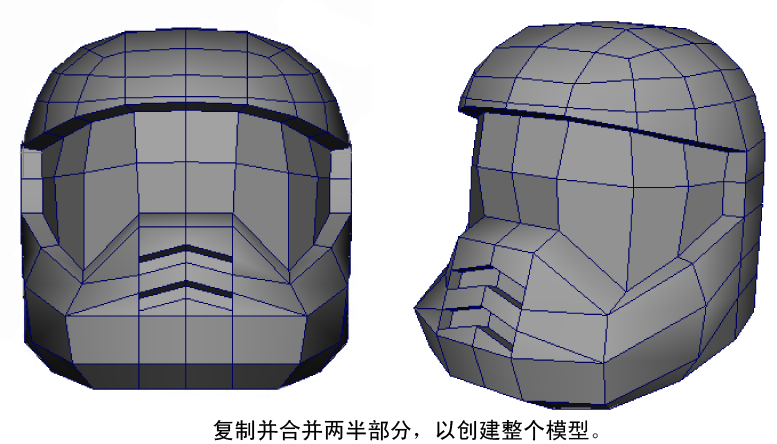 此时,低分辨率版本的头盔模型已完整。在下一节中,您将预览使用“细分曲面代理”(Subdiv Proxy)功能如何以更高的分辨率显示模型。