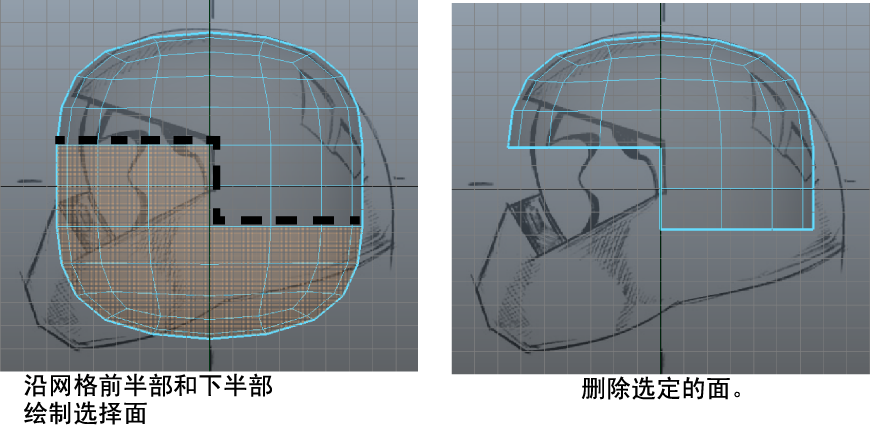 可以使用“绘制选择工具”(Paint Selection Tool)删除头盔网格的前方区域和下方区域上不需要的某些面。在需要选择的组件处于不规则区域中且不容易使用边界框选定时,该工具非常有用。