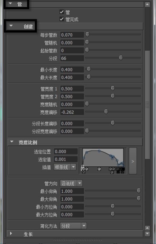 “管分段”(Tube Sections)定义网格笔划中管宽度周围的面数。更改“管分段”(Tubes Sections)将获得一系列的结果,具体取决于选择的笔刷类型。