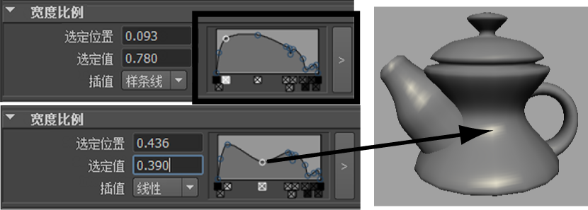 借助“宽度比例”(Width Scale)图表,可通过在索引点之间对形状进行插值操作来控制管的宽度。(如果仔细观察图表,您将看到茶壶的剖面是横着放的。)
