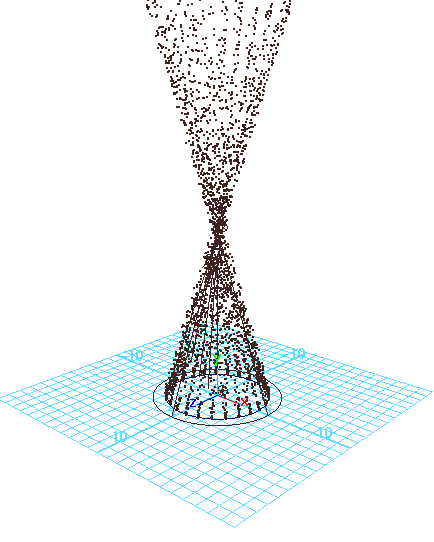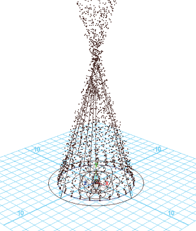 这会放置、旋转和缩放体积轴场,使其基础位于和圆形发射器相同的平面上。即使圆形向随机方向发射粒子,体积轴场也会将其运动重定向为沿圆锥体向上。