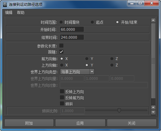 若要沿路径曲线设置飞机的动画,首先选择飞机和路径曲线,然后为运动路径动画设定相应的选项。在选项窗口中,需要为路径动画设定所需的时间范围。还需要确保将飞机的方向确定为面向移动的方向。“跟随”、“前方向轴”和“上方向轴”选项设置确定飞机沿路径的方向。