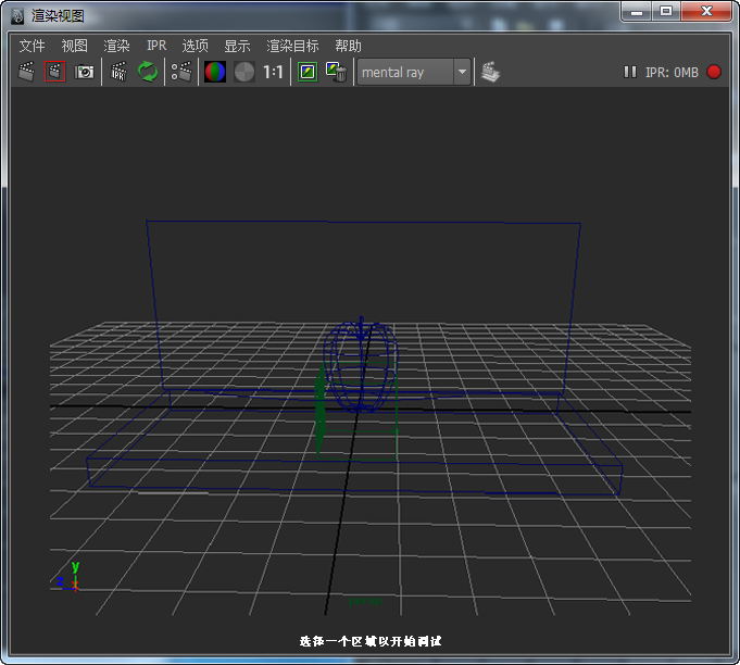 显示在 IPR 渲染视图窗口底部的消息说明“选择一个区域以开始调试”。在接下来的步骤中,您将创建图像的子区域,以便使用 IPR 进行渲染。