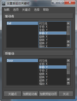 这会设定另一个受驱动关键帧,以将球的当前“平移 Z”(Translate Z)值链接到门的“平移 Y”(Translate Y)值。