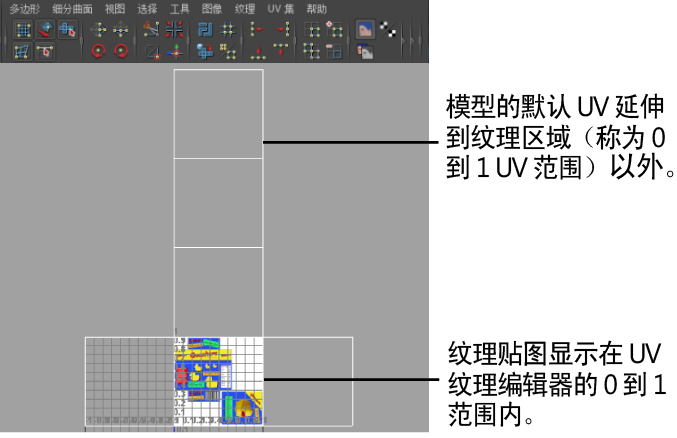 UV 最初并不在“UV 纹理编辑器”(UV Texture Editor)的 2D 视图中显示,直到在场景视图中选择某个对象或更改对象的选择模式。