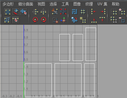在场景视图中选定顶部前边时,其中一个大型 UV 壳的顶边以及“UV 纹理编辑器”(UV Texture Editor)顶行中的中型 UV 壳的左侧也会被选定。对于饼干盒纹理贴图,需要将它们缝合到一起,以便它们与该贴图正确相关。