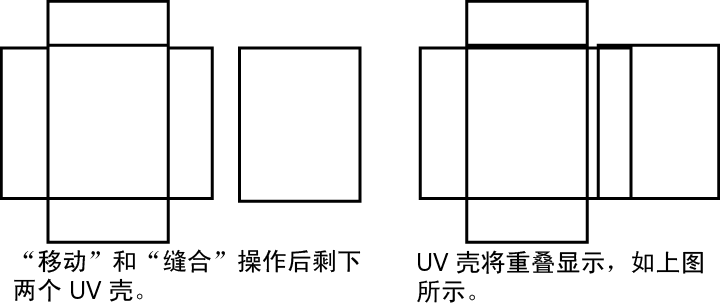 会重新定位小矩形 UV 壳,以使其与大型 UV 壳的顶部相匹配,并使这两个壳合并为一个。以后选择并移动这个已缝合的壳时,它将作为一个片段移动。如果选择两个 UV 壳进行缝合,则会将最小的 UV 壳移动到较大的 UV 壳。