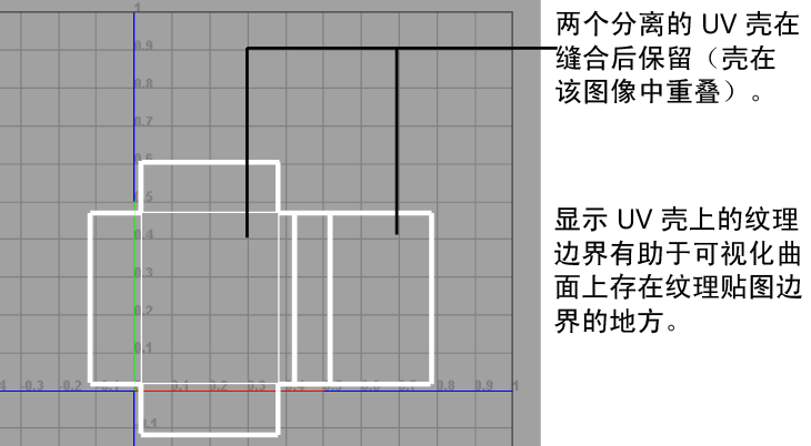 在“UV 纹理编辑器”(UV Texture Editor)中,现在两个 UV 壳的纹理边界将以一条较粗的线显示。