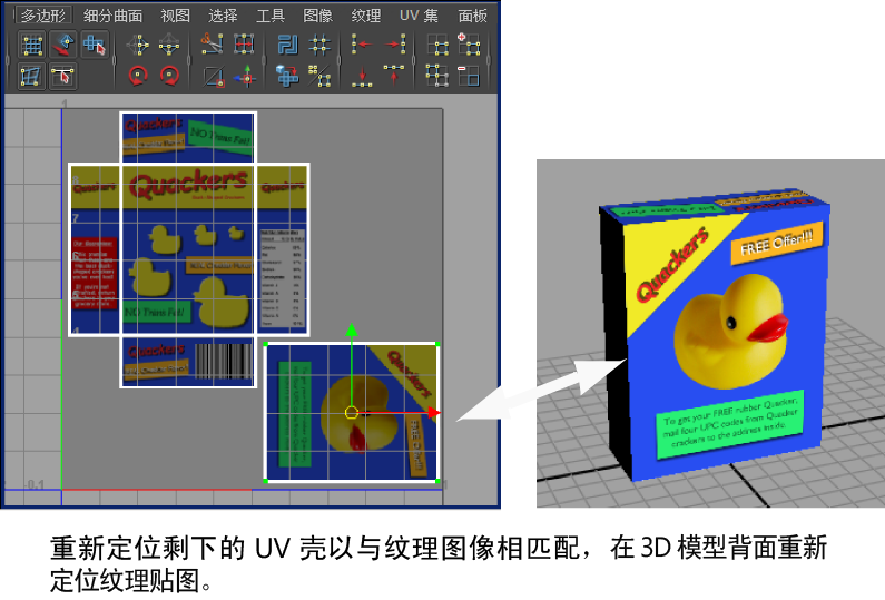 在接下来的步骤中,将在“UV 纹理编辑器”(UV Texture Editor)中重新定位这两个 UV 壳,使这两个 UV 壳与纹理图像重合。
